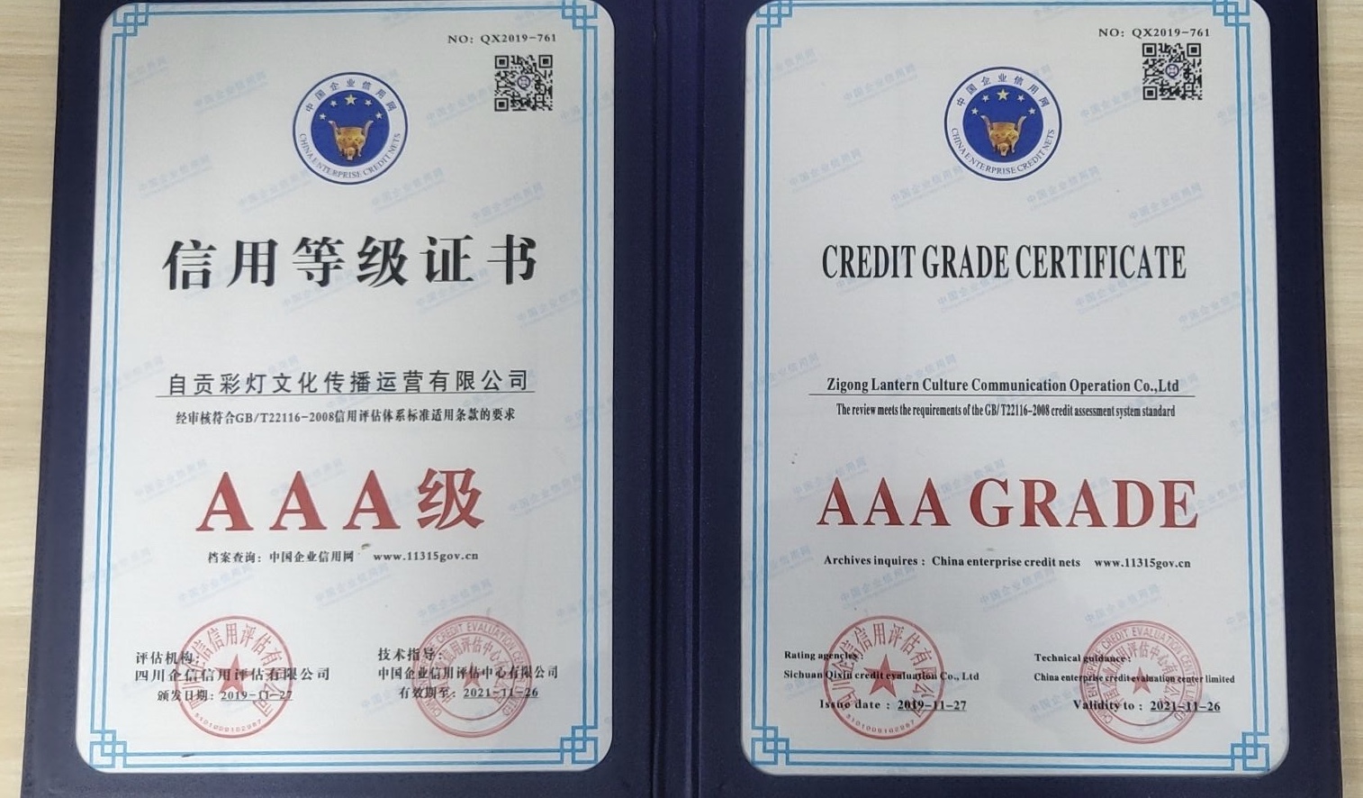 2022年11月,四川省人民政府發(fā)布《關(guān)于表彰四川省“金熊貓”獎先進集體和先進個人的決定》,對100個集體、200名個人予以表彰。其中,自貢彩燈文化傳播運營有限公司獲四川省“金熊貓”獎先進集體!