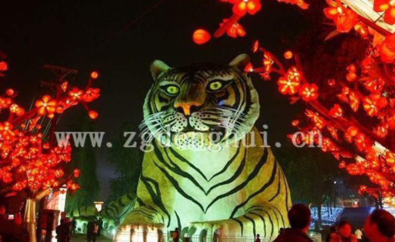 ——紀(jì)念塔廣場(chǎng),迎面高聳的大型燈組《天下第一虎》將給您巨大的震撼;⑹钦x、勇猛、威嚴(yán)的象征,被視為百獸之王。2010年生肖是虎年,《天下第一虎》主體燈組高約18米,身長(zhǎng)約44米,占地九百平方米。燈組采用寫實(shí)仿真手工皮毛繪制的手法塑造了一個(gè)活靈活現(xiàn),神態(tài)吉祥,吼聲雄厚,威儀八方的巨型老虎,以此祝福大家虎年吉祥、國(guó)泰民安。“天下第一虎”是歷屆燈會(huì)中最大型的仿真動(dòng)物彩燈,給人以強(qiáng)烈的視覺(jué)和聽覺(jué)震憾。展示了自貢彩燈工藝的宏大的氣勢(shì)、精美做工,以及自貢彩燈的獨(dú)特魅力。