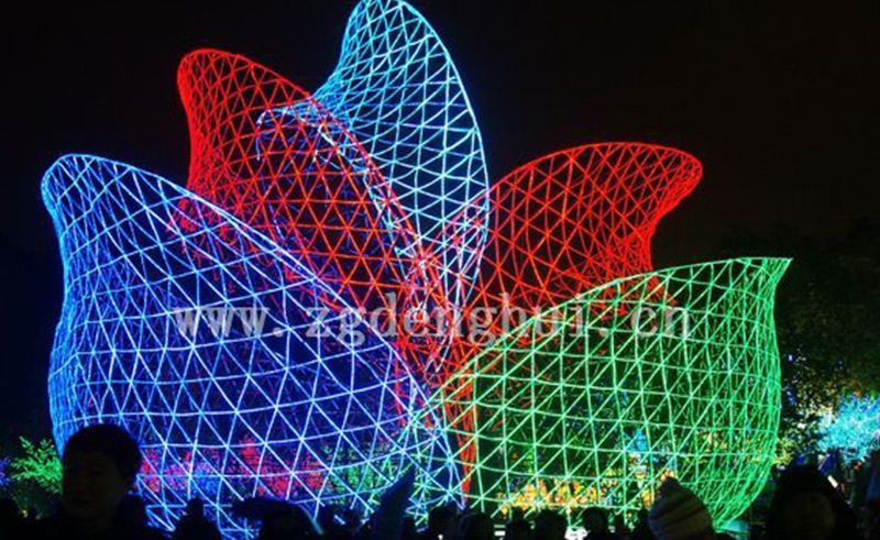 全新大型燈組《花開燈城》,是目前國內(nèi)最大的整體LED主題燈組。燈組采用LED新光源技術(shù),結(jié)合我市獨特的竹編新工藝,匠心獨具制作了一組巨大的藝術(shù)花卉主景燈,燈組制作土洋結(jié)合,工藝創(chuàng)新,觀賞度高。一流的工藝造型,一流的程序控制,一流的燈光效果,產(chǎn)生強(qiáng)烈的視覺沖擊力,高大18米的燈組似一顆巨大的夜明珠,在燈會中大放異彩。而在一號湖的大型水上燈《紅紅火火》,更是采取新工藝打造,燈組用手工編制了7千多只中國傳統(tǒng)大紅燈籠,組成8棵高達(dá)18米的巨大的燈籠樹,形成了動感十足、紅透半邊天的震撼效果。